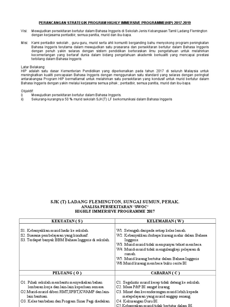 Highly Immersive Program - Free download as Powerpoint Presentation ppt pptx PDF File pdf Text File txt or view presentation slides online. SWOT ANALYSIS HIGHLY IMMERSIVE PROGRAMME HIP Strength S S1 Trained and experienced teachers S2 English reference including books magazine and other reading. STRATEGI MENJAYAKAN DUAL LANGUAGE PROGRAMME DLP DI BAWAH DASAR MBMMBI.